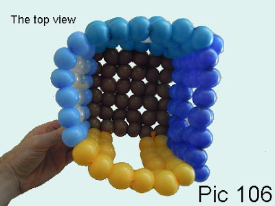 Twist a chain of the next six (the sixth through the eleventh) yellow bubbles. Lock the free end of the eleventh yellow bubble between two blue bubbles at the top corner of the wall (the second side of our cube). Twist the next two (the twelfth and the thirteenth) yellow bubbles. Lock the free end of the thirteenth yellow bubble between the next two blue bubbles. Twist a chain of the next two (the fourteenth and the fifteenth) yellow bubbles. Lock the free end of the fifteenth yellow bubble between the next two blue bubbles at the corner. Twist the sixteenth yellow bubble. Lock the free end of the sixteenth yellow bubble between the two brown bubbles at the corner (Pic 100).