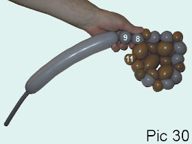 Hedgehogs comes in different colors in the nature. And so we can use different colors balloons to make the sculptures. Pink, yellow, brown, black, gray, blue (for Sonic hedgehog cartoon character) and etc. I choose brown color for the body and gray for the top of my hedgehog. We can work the top of the sculpture in different ways to make different shapes. I rather use just one balloon for the top. Inflate gray balloon leaving about eight-inch flat tail. Tie the nuzzle of the gray balloon at the base of the tail (the sixteenth brown) bubble (Pic 21).