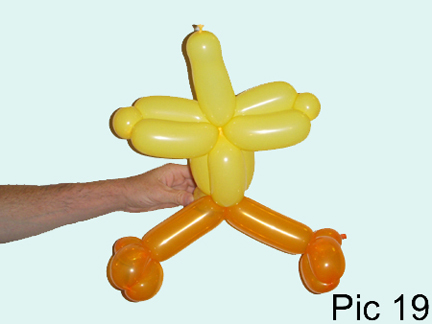 Use a different color balloon to make the legsAttach the legs to the body by locking the legs bubbles between the body and the tail bubbles (Pic 16 through 19).