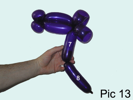 The next two bubbles we twist to make the torso. Twist the 7th five—inch bubble (Pic 13). The rest of the balloon is the eighth bubble. Just make sure the eighth bubble is about the same size as the seventh bubble.